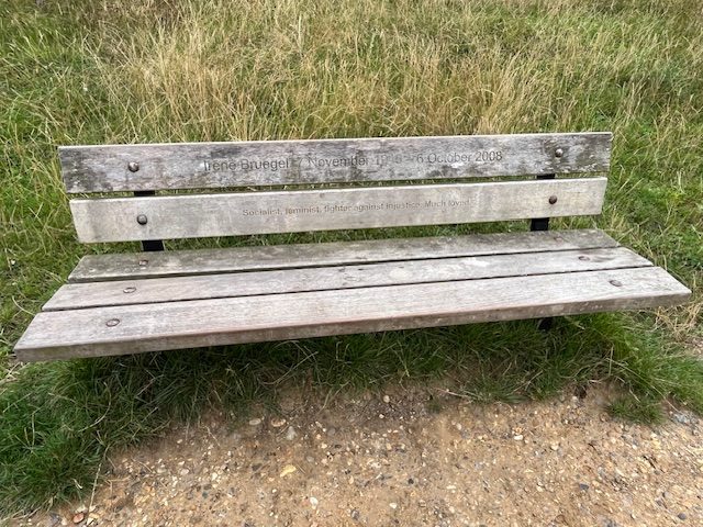 Not far away, on Hampstead Heath, stands a different radical memorial. This time it’s a wooden bench where every night & day people can sit & rest – or remember Irene Bruegel. She died in Autumn 2008 . In her lifetime she engaged in many politically important activities (still relevant today…) Here she was described as a ‘socialist, feminist, and fighter against injustice’ and ‘much loved’.