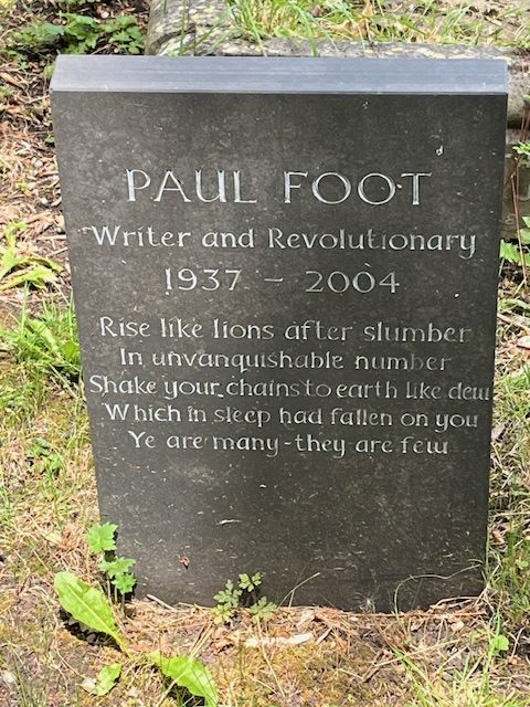 Physically closer to Marx’s words is the memorial of Paul Foot described in 2004 as a ‘writer and revolutionary’ , but also known to many, not primarily as the nephew of LP leader Michael Foot, but as a leading light in the Socialist Workers’ Party. The word ‘comrade’ is not used here but the words of Shelley from ‘The Mask of Anarchy’ asserting ‘Ye are many – they are few’.
