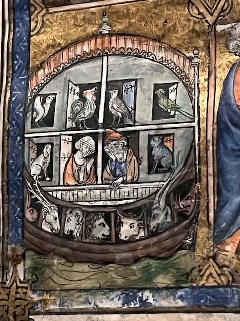 Many of the images in the National Gallery’s display from March until late June displayed works from Siena in the 1300s. Much representation was of religious material but items which do present animals or perhaps I’m just searching for them. Looking at an manuscript item of Equity and felony, leaf from Laurent d’Orleans, La Somme le foi c.1290 – 5 appeared an aspect of Noah’s ark from Genesis in the Old Testament.Here stood a cat alongside animals not necessarily seeing just humans but animals from other groups.