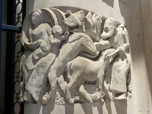 But there are other images of animals outside certain buildings – if we are looking for them.For instance in a side turning, off Leicester Square, is a listed building, The Church of Notre Dame de France,(a Roman Catholic church) previously extant since the late C18th but rebuilt by architect Hector O.Corfiato in the 1950s. Inside are frescoes by Jean Cocteau, but outside on two pillars is a series of eight scenes from the life of Mary, carved by students from the École des Beaux-Arts – accompanied by various animals .