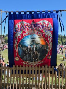 Arising from the last gala I previously mentioned the visual image of Flack, the last pit pony to work in a British coal mine, ‘retired’, like other animals in 1994, & displayed in a poster. But now clearly presented on a Bearpark lodge banner was an image of a former horse alongside the men who also worked there. While such a situation was very difficult for horses in the pits, it seems here the joint animal – human activity was being clearly remembered – and now historically displayed.