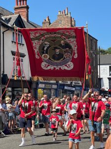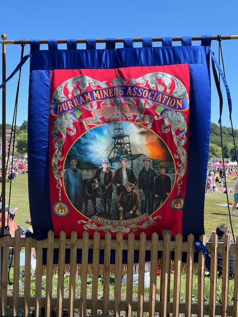 This year’s Durham miners gala displayed many banners.Free from the rain of 2024 many were shown in different ways. While the Chopwell had been presented many times before recently it was now just led by children wearing their own T shirts depicting the clear politics!